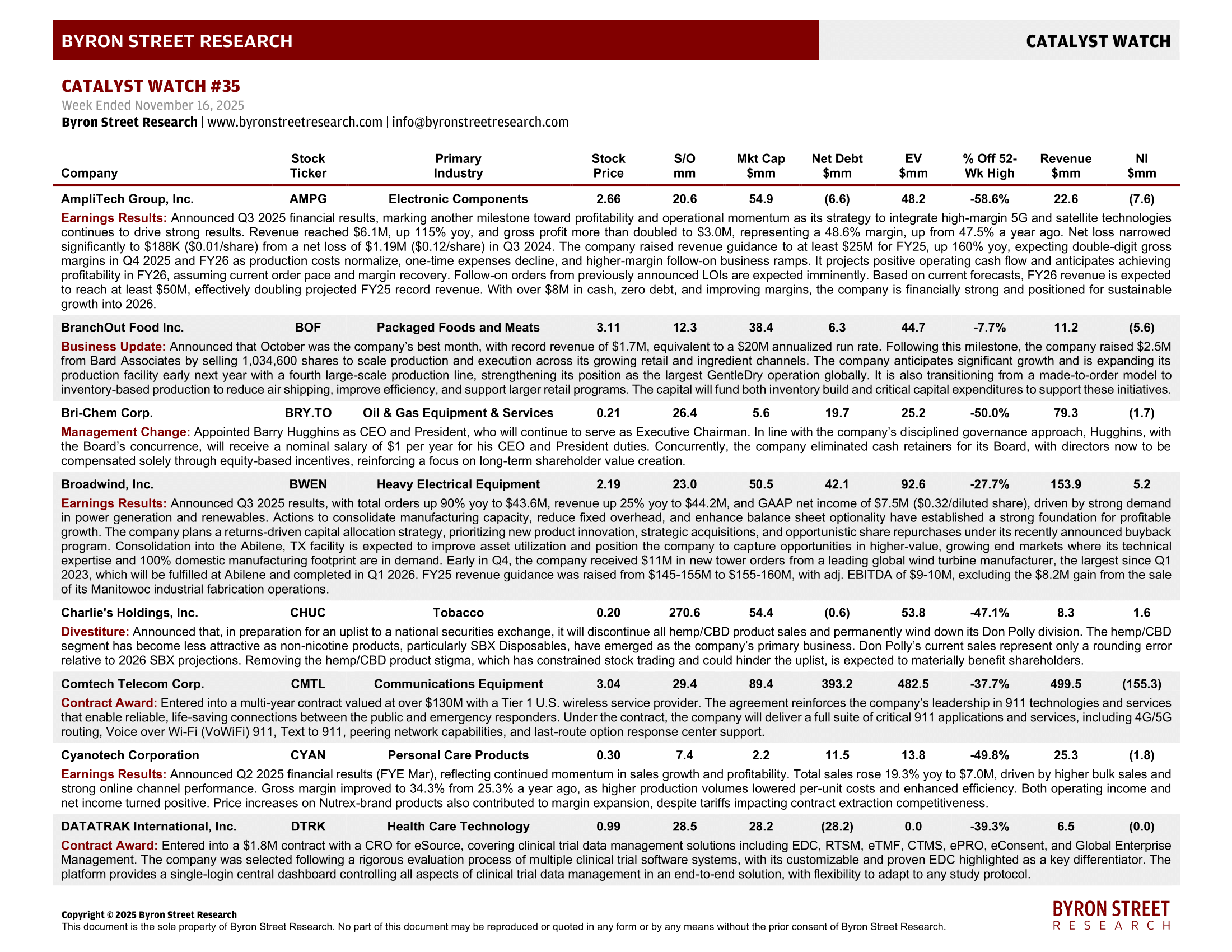 Earnings Results: Announced Q3 2025 financial results, marking another milestone toward profitability and operational momentum as its strategy to integrate high-margin 5G and satellite technologies continues to drive strong results. Revenue reached $6.1M, up 115% yoy, and gross profit more than doubled to $3.0M, representing a 48.6% margin, up from 47.5% a year ago. Net loss narrowed significantly to $188K ($0.01/share) from a net loss of $1.19M ($0.12/share) in Q3 2024. The company raised revenue guidance to at least $25M for FY25, up 160% yoy, expecting double-digit gross margins in Q4 2025 and FY26 as production costs normalize, one-time expenses decline, and higher-margin follow-on business ramps. It projects positive operating cash flow and anticipates achieving profitability in FY26, assuming current order pace and margin recovery. Follow-on orders from previously announced LOIs are expected imminently. Based on current forecasts, FY26 revenue is expected to reach at least $50M, effectively doubling projected FY25 record revenue. With over $8M in cash, zero debt, and improving margins, the company is financially strong and positioned for sustainable growth into 2026.